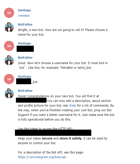 ¡Ya está! nos ha escrito el Token y el link donde podemos ver toda la documentación oficial del API. Solo tenemos que buscar al bot, abrir un chat con él y darle a iniciar.